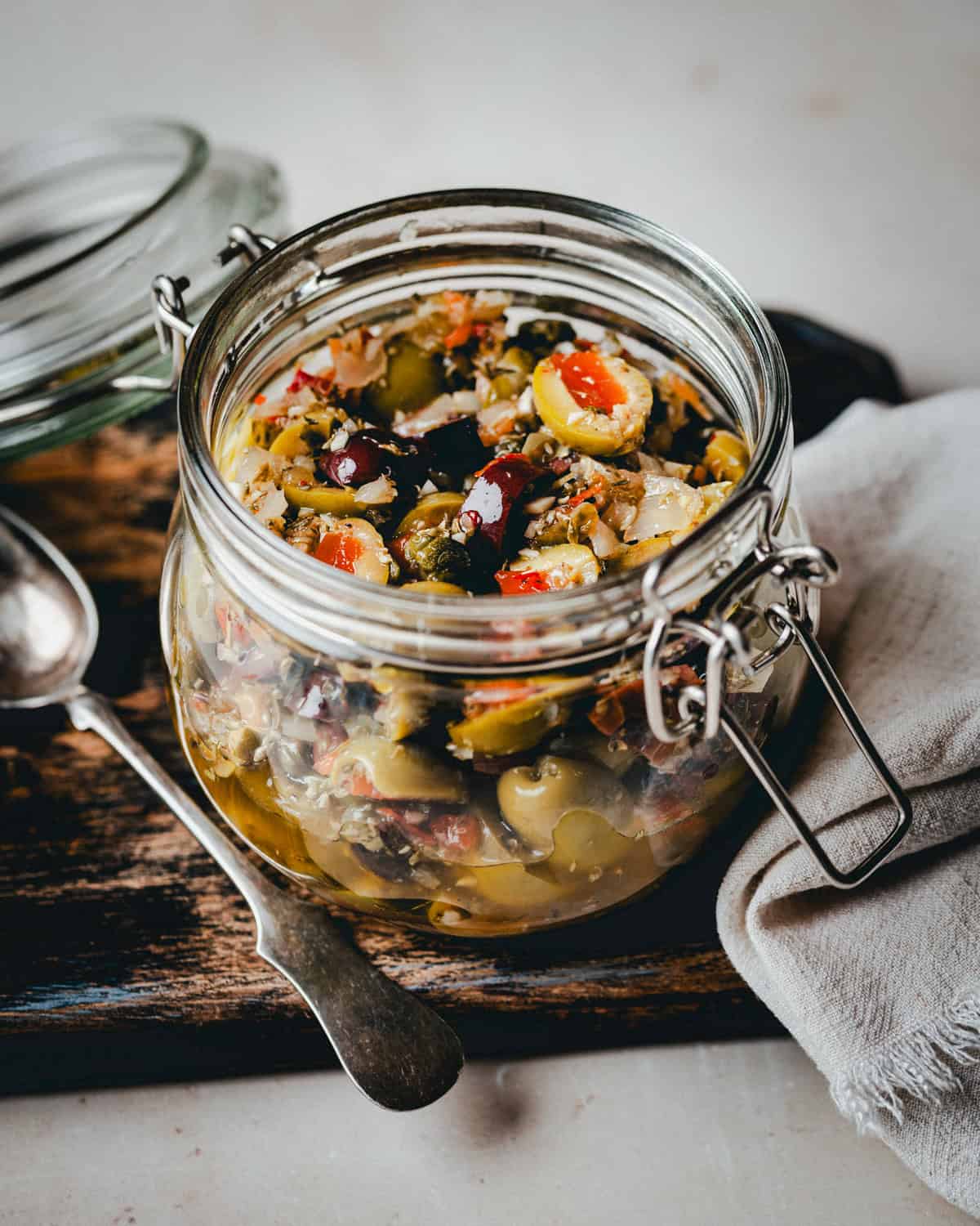Combine and marinate. Pour the dressing over the olive mixture and stir to coat. Transfer to a jar, pressing gently so everything is submerged. Refrigerate at least 24 hours before serving. For the most authentic flavor, let it rest 5 to 7 days. Stir before serving.