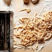 Attach pasta cutting attachment and dust the blades lightly with flour. Run dough through finest cutter (spaghetti-sized ideally). (Recipe Note #4) Dust noodles with flour to coat and separate and place on prepared baking sheet. Repeat with remaining dough pieces.