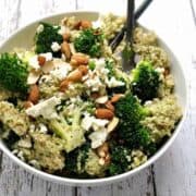 Add broccoli pesto, remaining broccoli florets and cooked quinoa to a large serving bowl; gently stir to combine. Top with remaining almonds and feta. Serve.
